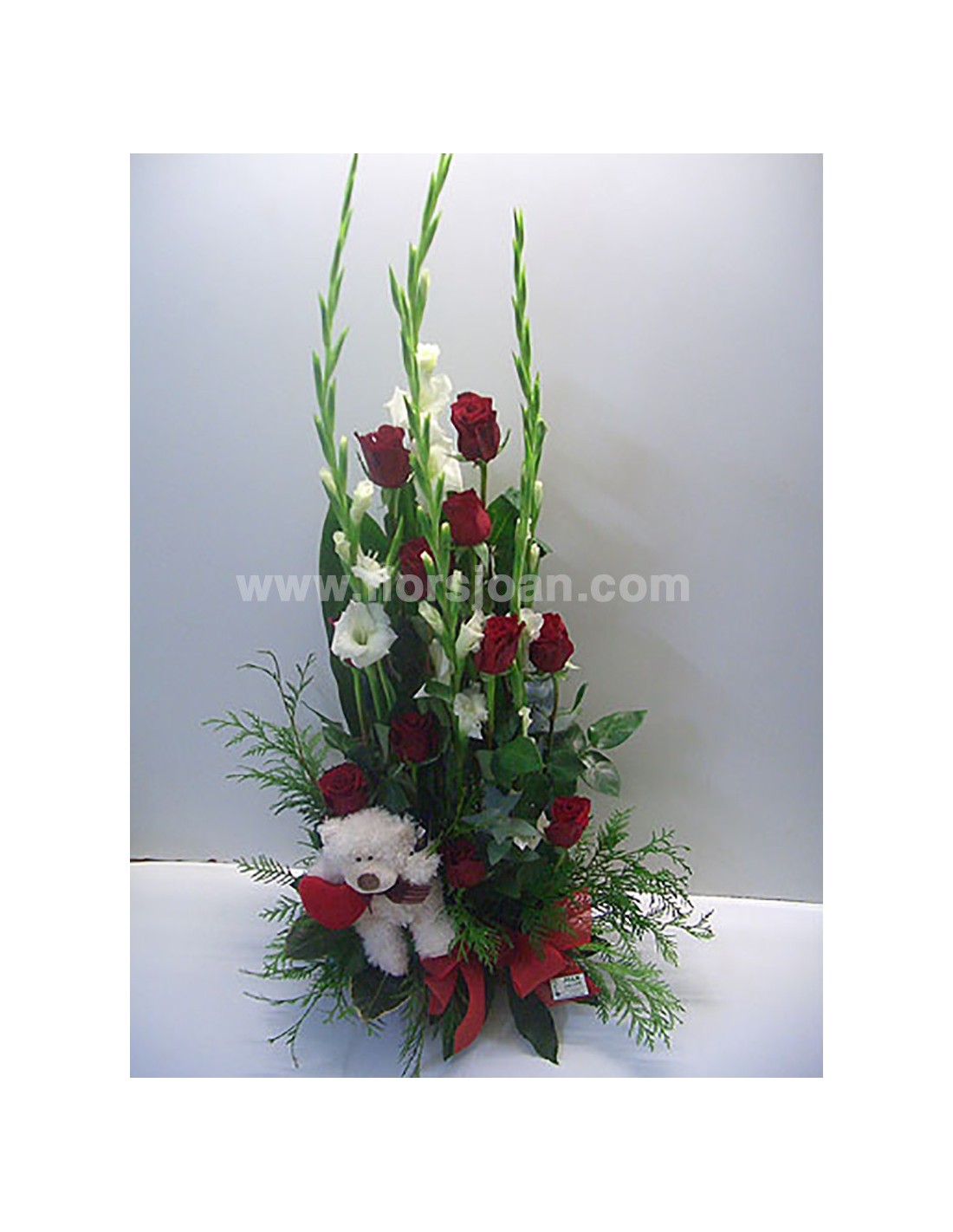 Centro con 10 rosas, gladiolos y peluche.