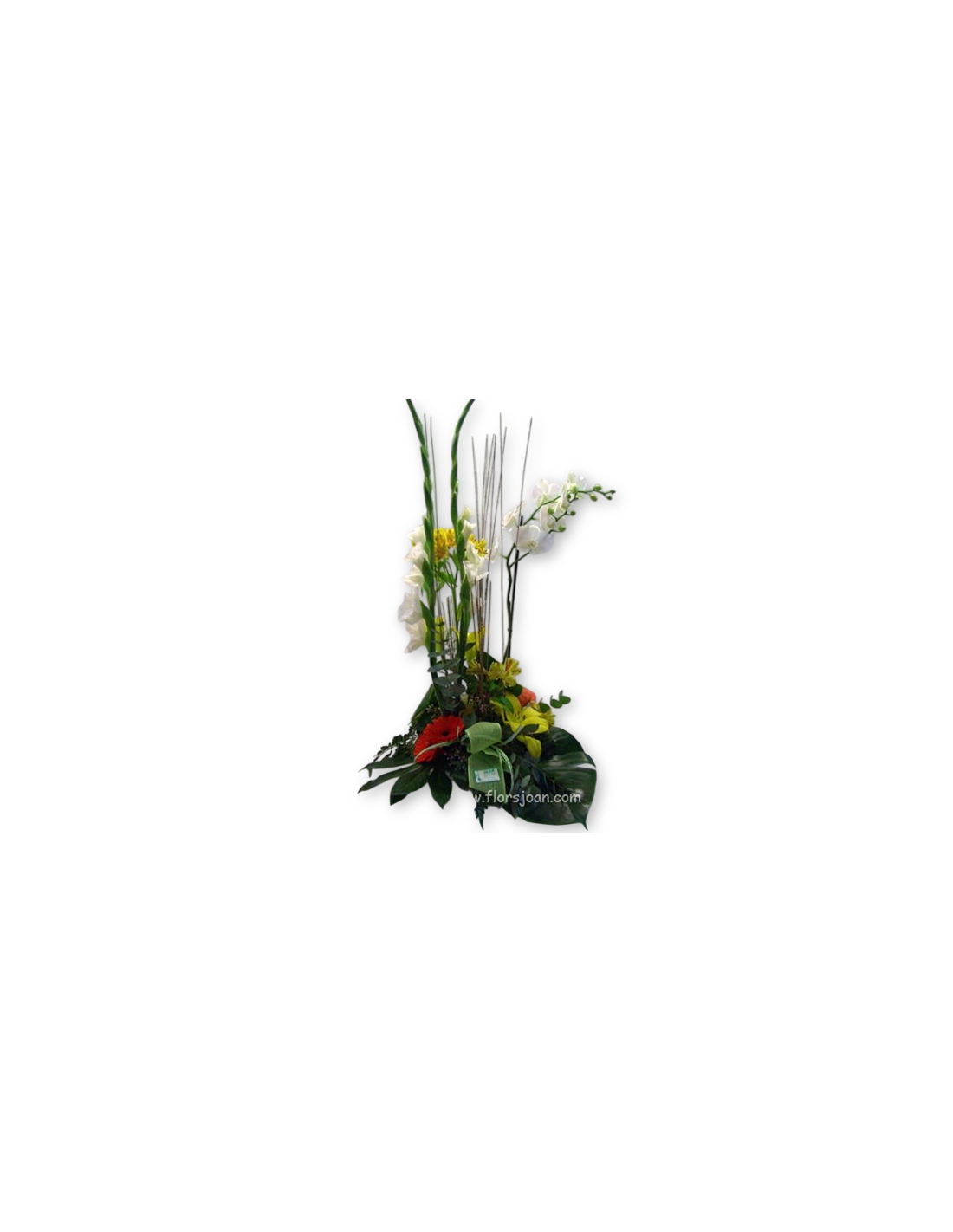 Centro en tonos amarillos con orquídea y flores de temporada.