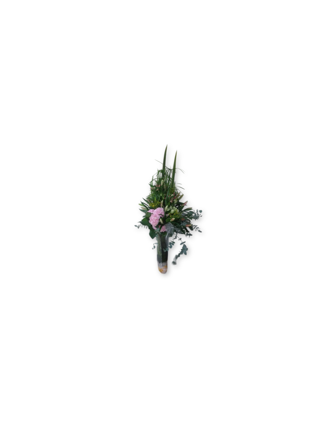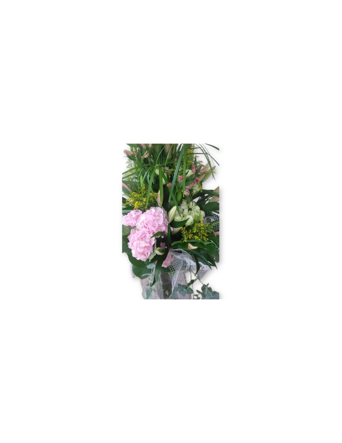 Jarrón de cristal de 60 cm. con 10 liliums orientales, 10 rosas blacas , añlstromenia rosas, , 5 hortensias y verdes variados