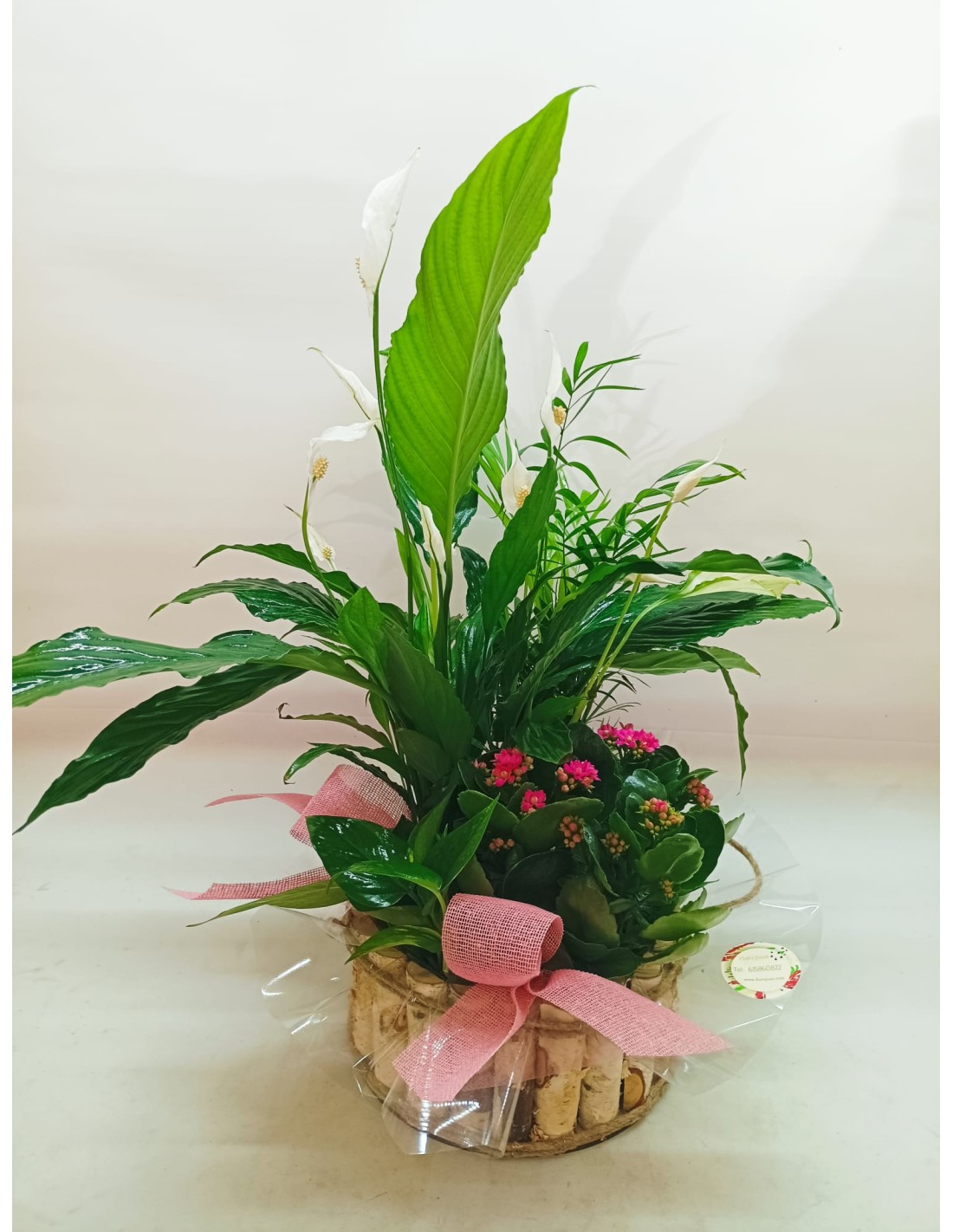 Cesta de mimbre con plantas de interior. Altura de 60 cm. Necesita riego una vez por semana. Poca agua.